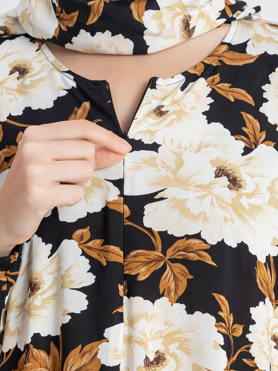 A beautifully designed burqa gown featuring delicate floral prints for an elegant and modest look.