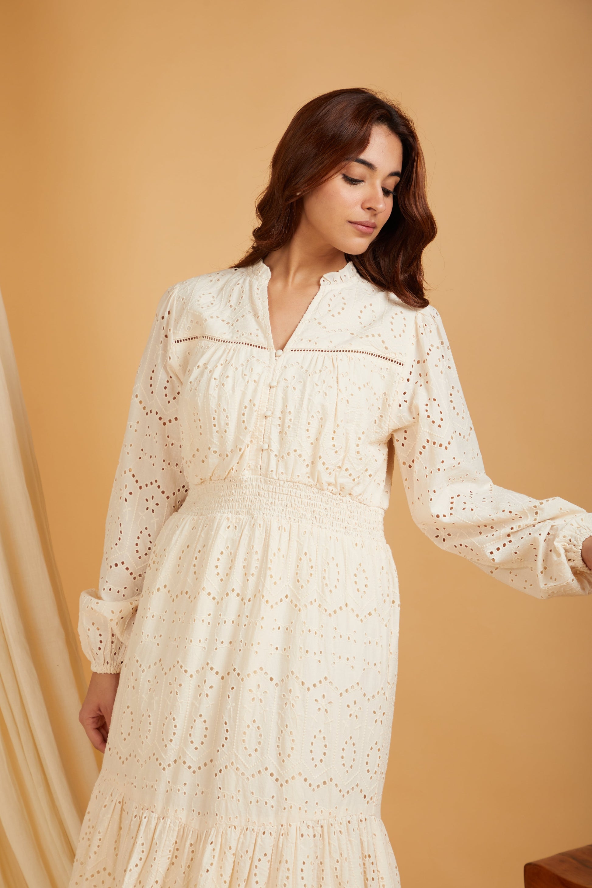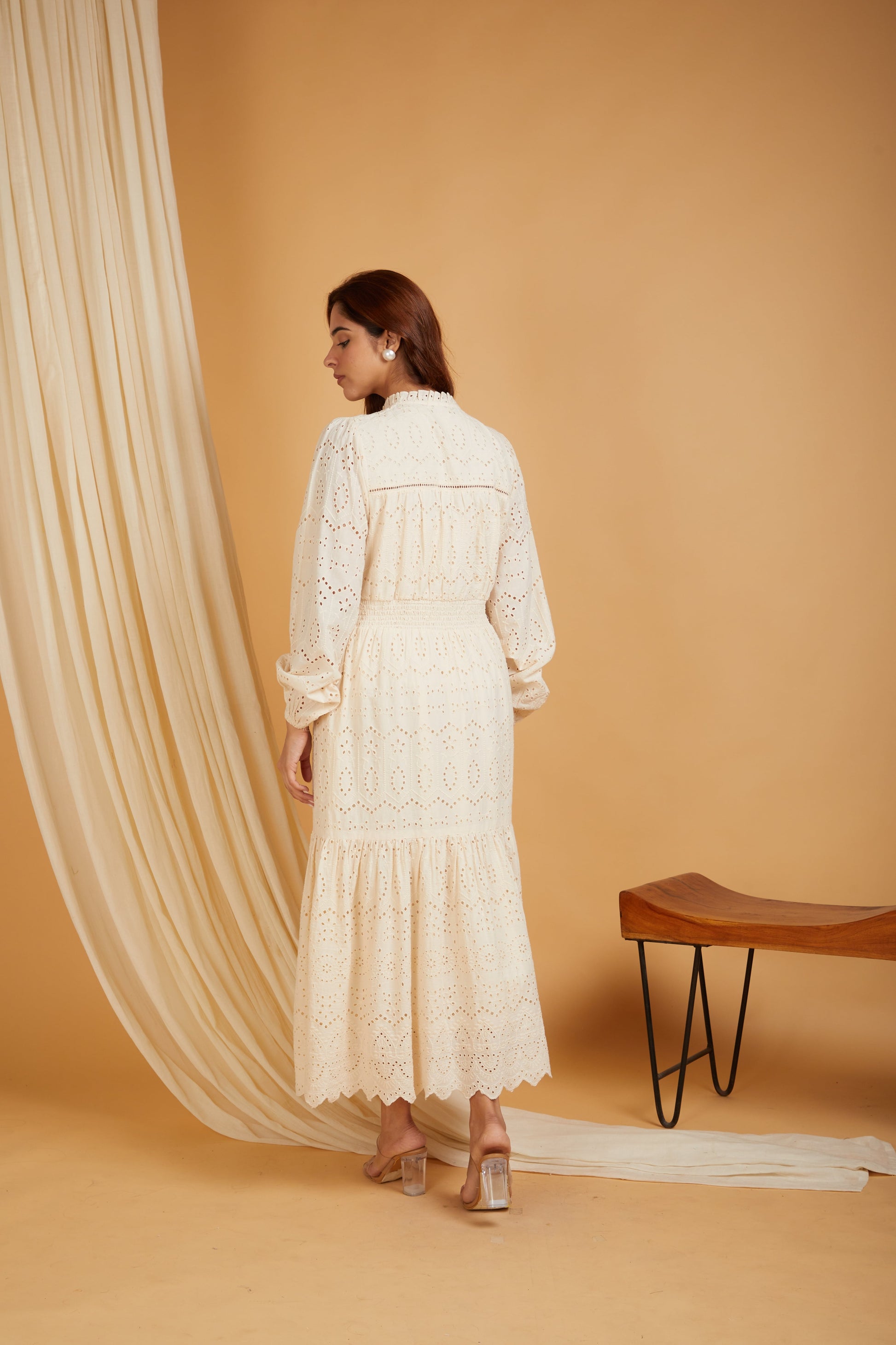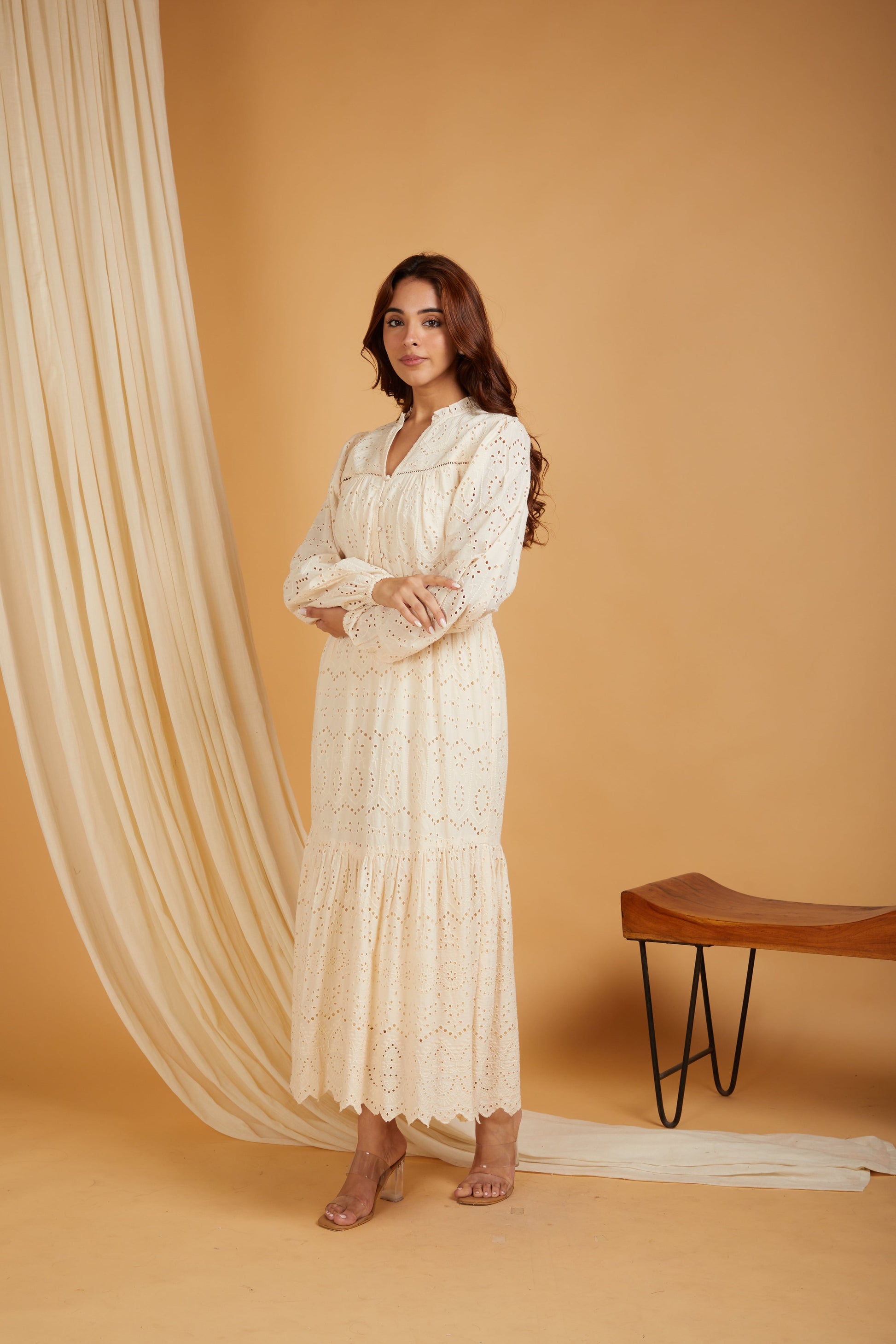 A Schiffli-embroidered tiered maxi dress with stylish puff sleeves, offering a blend of elegance and comfort.