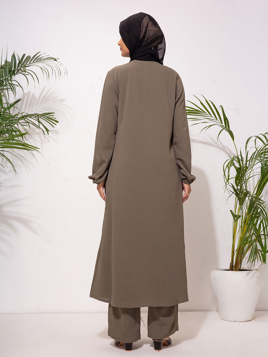 Step into effortless style with our Olive Green Two-Piece Set, a versatile outfit designed for the modern modest woman. Featuring a sleek long tunic with asymmetrical button details and matching wide-leg trousers, this set blends comfort, coverage, and sophistication.